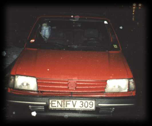 Leider währte die Freude am quasi jungfräulichen Zustand des Peugeot's nicht sonderlich lange, weil ein Citroen XM vor mir an einer auf Gelb gesprungenen Ampel eine Vollbremsung hinlegte, während ich gerade durchstarten wollte. Die kaltverformte Frontpartie liess ich fachmännisch für 250,- DM bei einem anerkannten Bochumer Karosseriespezialisten (ein Meister des Vorschlaghammers) richten, danach konnte man auch wieder die Motorhaube ohne rabiaten Krafteinsatz öffnen. |