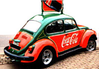 | Als meine Frau dann ihren Führerschein hatte, war für uns klar, daß auch sie auf einem Käfer zu fahren anfängt. Wir haben ihr damals (das war 1992) einen 1200ter gekauft, Baujahr 1969, haben wiederum 2.300 Mark bezahlt und meine bessere Hälfte hat glänzend Autofahren gelernt. Wer Käfer fahren kann, meinen wir beide noch heute, ist Schlechtes gewöhnt und kommt auch mit anderen Autos gut zurecht. Den rot-grünen Käfer (s. Photo rechts) hat der Arbeitgeber meiner Frau (na, wo arbeitet sie wohl...?) für Promotion-Zwecke herrichten lassen. Der fährt noch heute. |