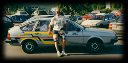 ![]() Der schöne Harald und der noch schönere Passaratti | Die neue Tür war weinrot, also nicht gerade passend und so kam es zu einer bunten Sprühdosenlackierung in allen möglichen Farben - eine wahre Lackierungsorgie. So gewappnet kann man sich schon mal auf einem Autotreffen sehen lassen. Die Wahl fiel auf das erste VW Forum in Castrop Rauxel 1991. Die Wahl des Beifahrers fiel auf den Waldmeister, auch schöner Harald genannt. Ab Samstag war Treffen, wir fuhren vorsichtshalber am Freitag los um irgendwo unterwegs eine Sause zu machen - die Wahl fiel auf Köln. |