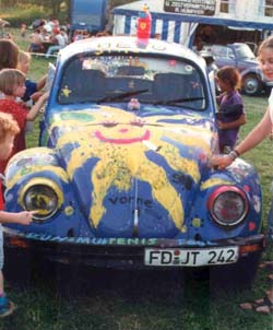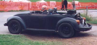 Irgendwie wurde 1996 aus dem Winterauto (geil mit 255ern auf verschneiter Fahrbahn) ein Sommerauto, denn ich hatte einen Totalschadenspeedster bekommen und kurzerhand den Verstärkungssatz umgebaut. Mit einem 69er Fahrgestell versehen dafür aber des Daches beraubt, ging es zum TÜV. Nach zähen Verhandlungen bekam ich "ohne Rundumverglasung" eingetragen. Das war die Show, ein "normaler" Käfer mit zugeschweissten Türen, ohne Dach, ohne Frontscheibe, ohne Motorhaube aber mit schwarzen Kennzeichen auf legalem Weg zugelassen - 21 Polizeikontrollen habe ich seitdem gehabt. Da nun der Begriff "Matschblase" nicht mehr zutraf, entstand aus Astrids Airbrush für die Fronthaube der neue Namen die "Ratte". Soweit ich weiss, war es so ziemlich der erste Versuch den Kult um die Ratten aus der amerikanischen Motorrad- und HotRadscene in die VW Scene einzuführen, daher stand auch die Farbe fest: mattschwarz!
