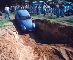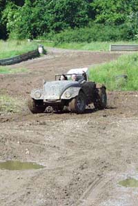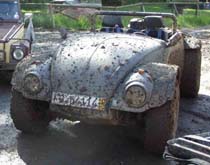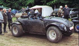 Leider habe ich nur noch dieses schlechte Photo aus Chateau d'Oex 1996 (das war 'ne nasse Fahrt). 1997 stand dann der nächste Umbauschritt an: Die Kotflügel wichen Selbstbau-Teilen aus GfK, Hasendraht, Industriegummimatten und LKW-Kotflügelteilen. Die Front wurde wegen des besseren Böschungswinkels hochgezogen und das Heck wie bei einem Streaker gekürzt. Zusammen mit dem Eigenbauauspuff bringt das im Gelände echte Vorteile. Ein Überrollbügel schützt dabei vor Überschlägen und grobstollige 31x10,R15 auf 8x15 ET-25 vorne und 33x12,5R15 auf 10x15 ET -46 plus 35er Distanzscheiben hinten machen die Ratte fit fürs Gelände. Ach ja - natürlich ist alles eingetragen!
