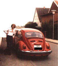 | Als meine Frau dann ihren Führerschein hatte, war für uns klar, daß auch sie auf einem Käfer zu fahren anfängt. Wir haben ihr damals (das war 1992) einen 1200ter gekauft, Baujahr 1969, haben wiederum 2.300 Mark bezahlt und meine bessere Hälfte hat glänzend Autofahren gelernt. Wer Käfer fahren kann, meinen wir beide noch heute, ist Schlechtes gewöhnt und kommt auch mit anderen Autos gut zurecht. Den rot-grünen Käfer (s. Photo rechts) hat der Arbeitgeber meiner Frau (na, wo arbeitet sie wohl...?) für Promotion-Zwecke herrichten lassen. Der fährt noch heute. |