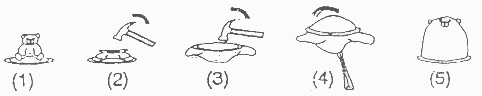 | Zunächst setzen wir das vorher betäubte Gummibärchen liebevoll in die Mitte des Gardinenrings (1). Nach Schwarzeneggermanier prügeln wir jetzt wie besessen auf die Omme von dem dummen kleinen Gummibärchens (2), bis das platt vor Neid ist und kapitulierend über den Rand des Gardinenrings hinaushängt (3). Den so entstandenen Weichgummirohling pressen wir geschickt mit dem Kaffeelöffel durch den Gardinenring und dellen ihn so vorsichtig aus (4). Du kannst dabei den Kaffeelöffel ruhig hart rannehmen, ein guter Löffel hält so etwas aus! Mit etwas Geduld formst Du so ein wunderschönes Kondom - ganz Geschickte erhalten das Gesicht des Rohstoffgummibärchens und bringen so das Kondom zum grinsen (5). |